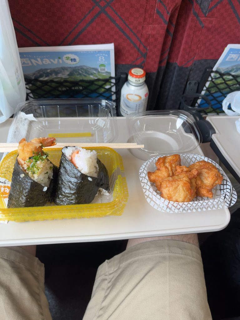 新幹線車内では、東京駅の新幹線乗り場近くのおにぎりやで買った