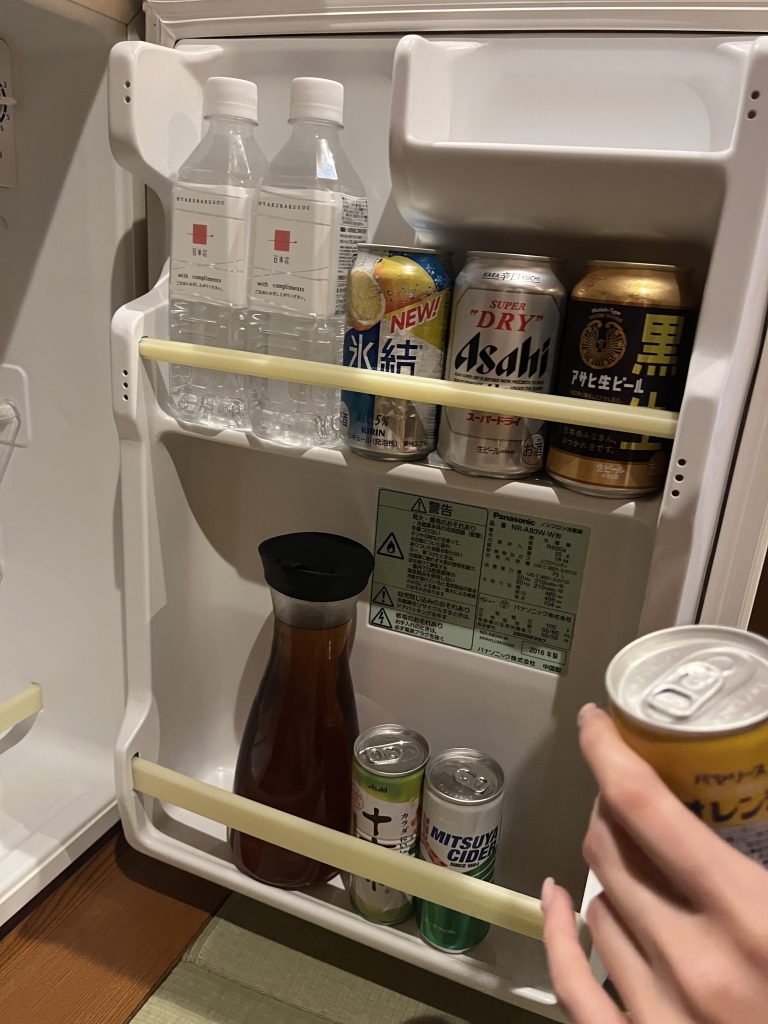 冷蔵庫の中の飲み物は宿泊費にふくまれているので飲み放題。
